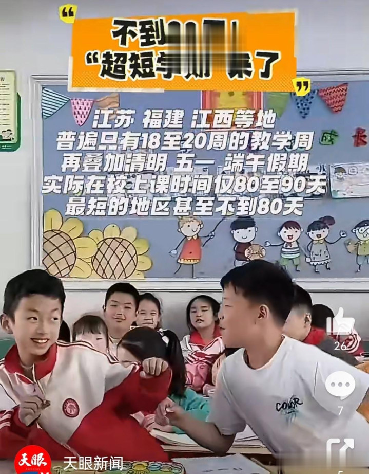 再把清明、五一、端午三个小长假算进去,全国各地中小学的实际在校上课时间普遍在80至90天之间。江西、福建等地的情况也大致相同。